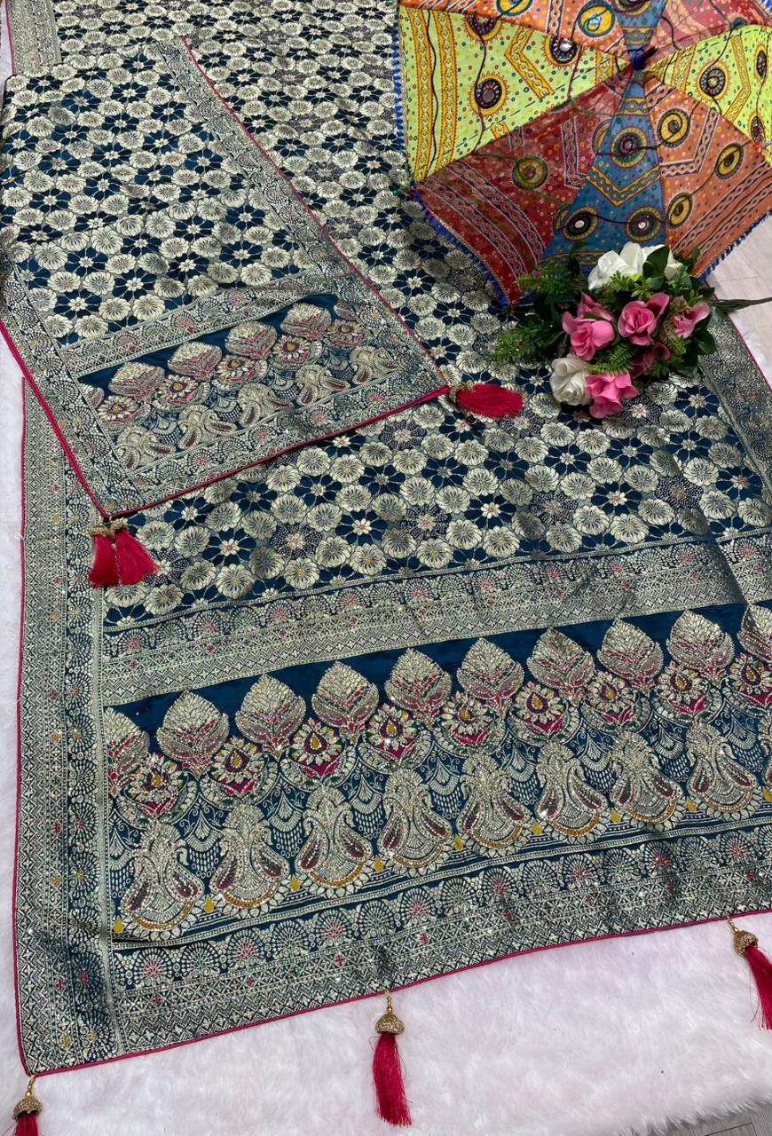 AJ-AWANTIKA-DUPTTA SATIN SILK SAREE WITH FULL HEAVY JARKAN WORK WITH HEAVY PIPING AND LUXURY TASSELS WITH DUPPATA WITH JARKAN WORK AND MOST TRENDING SAREE
