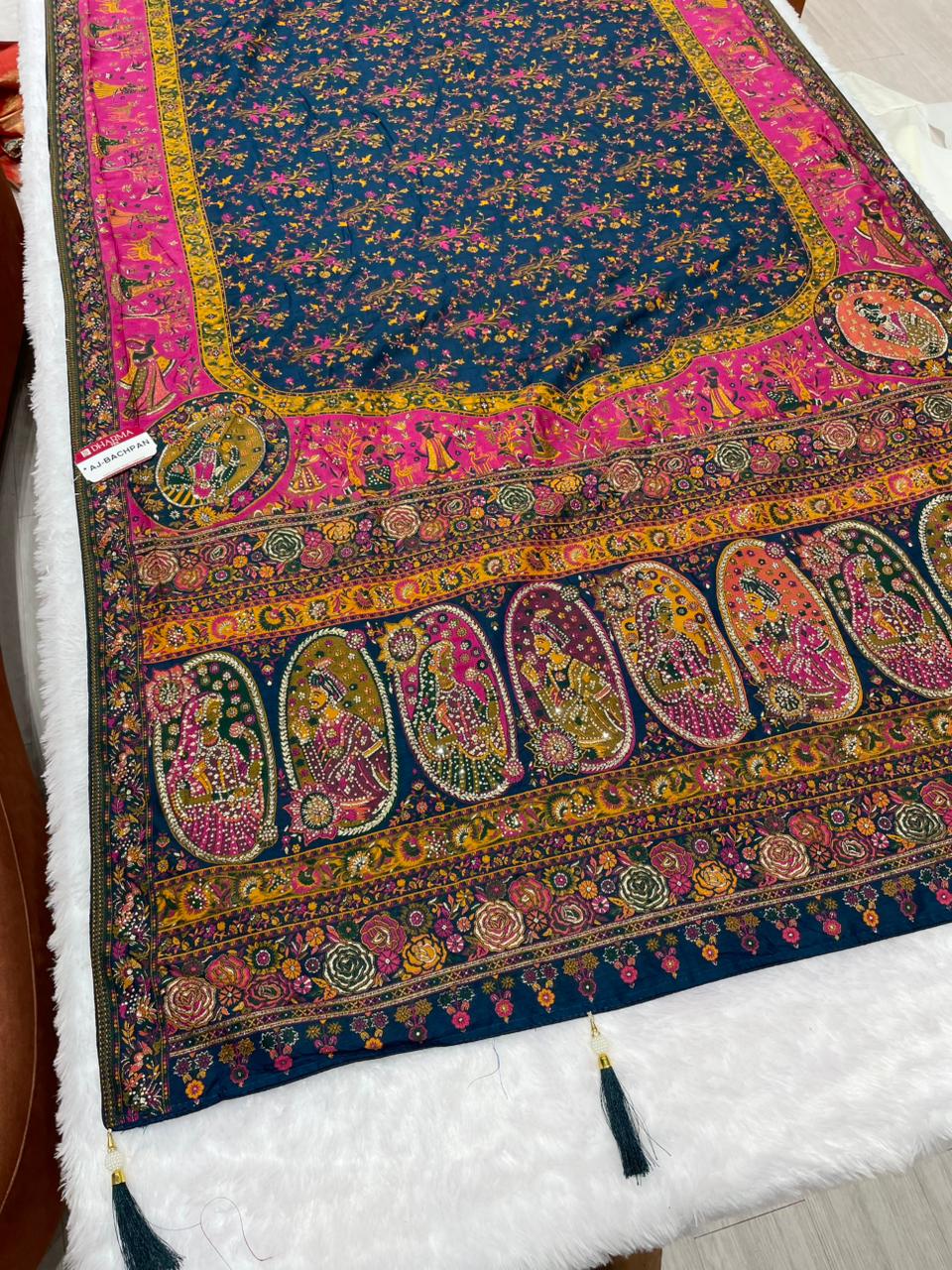 AJ-BACHPAN PASHMINA DIABLE SILK WITH HEAVY JHAL DESIGN WITH RICH PALLU AND TISSUE HEAVINESS WITH JARKAN WORK WITH PIPING AND LUXURY TASSELS