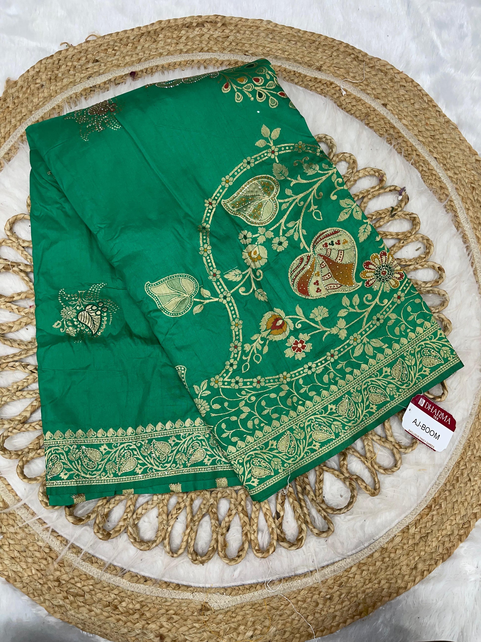 AJ-BOOM DOLA DIABLE SILK WITH HEAVY DESIGN WITH OPEN PALLU AND DMC WORK ALL OVER WITH LUXURY TASSELS
