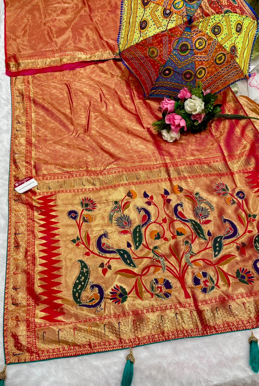 AJ-KETKI-DUPATTA KANJIVARAM TISSUE SAREE WITH DUPATTA AND HEAVY JARKAN WORK WITH PAITHANI DESIGN