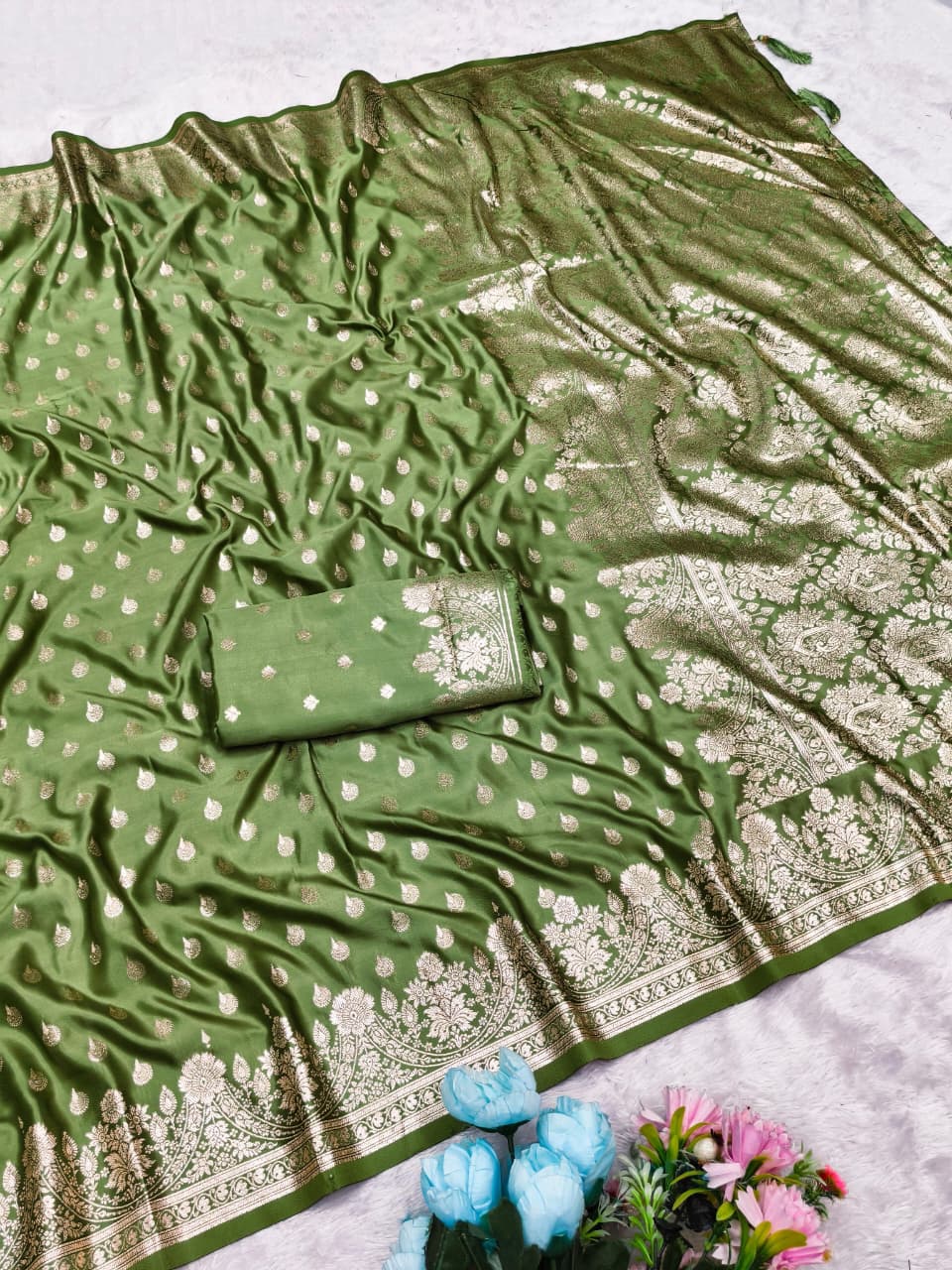AJ-SATIN-AGRA SATIN SILK SAREE WITH RICH PALLU AND BEAUTIFUL DUSTY MATCHING PURE BOLLYWOOD DESIGN