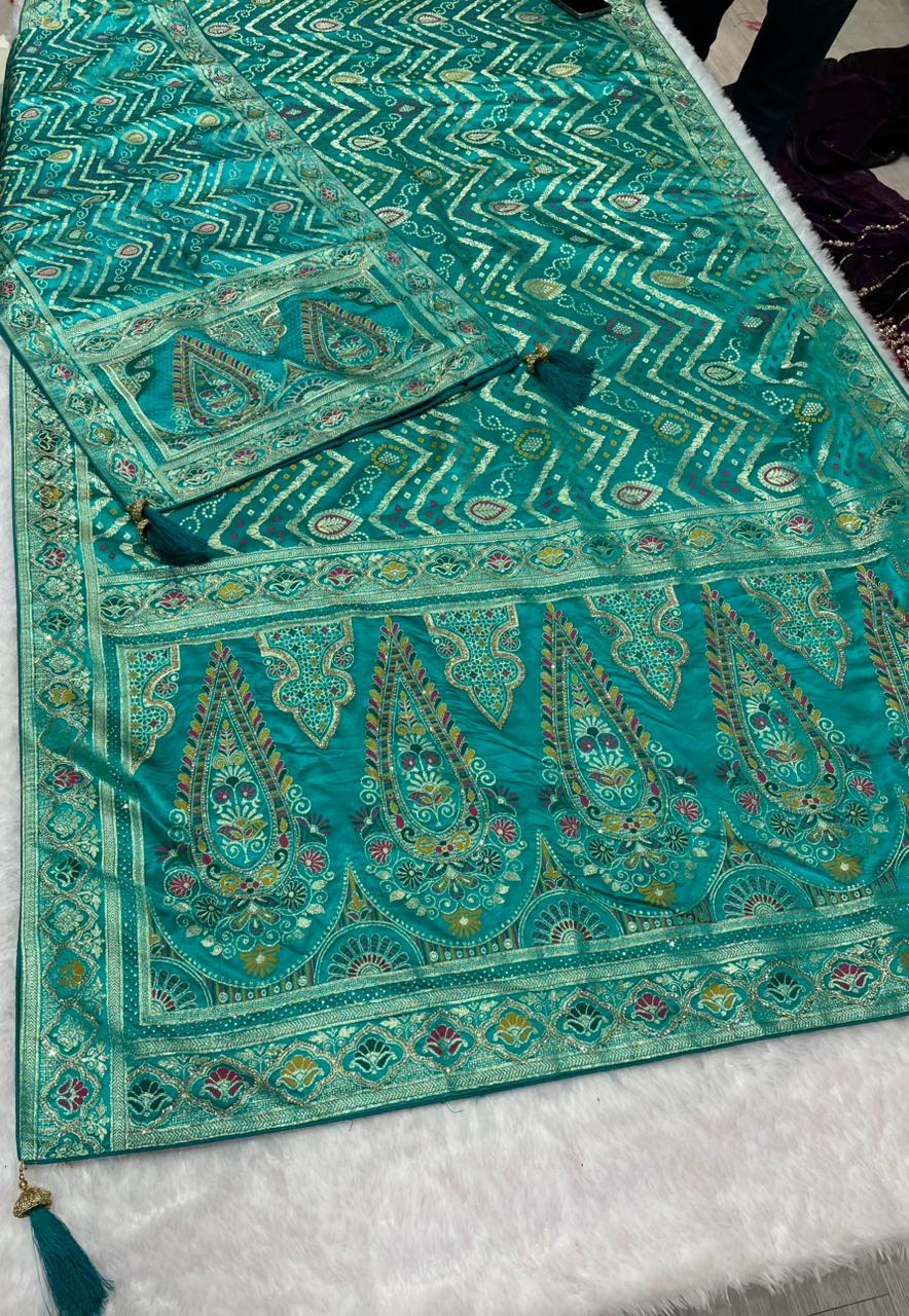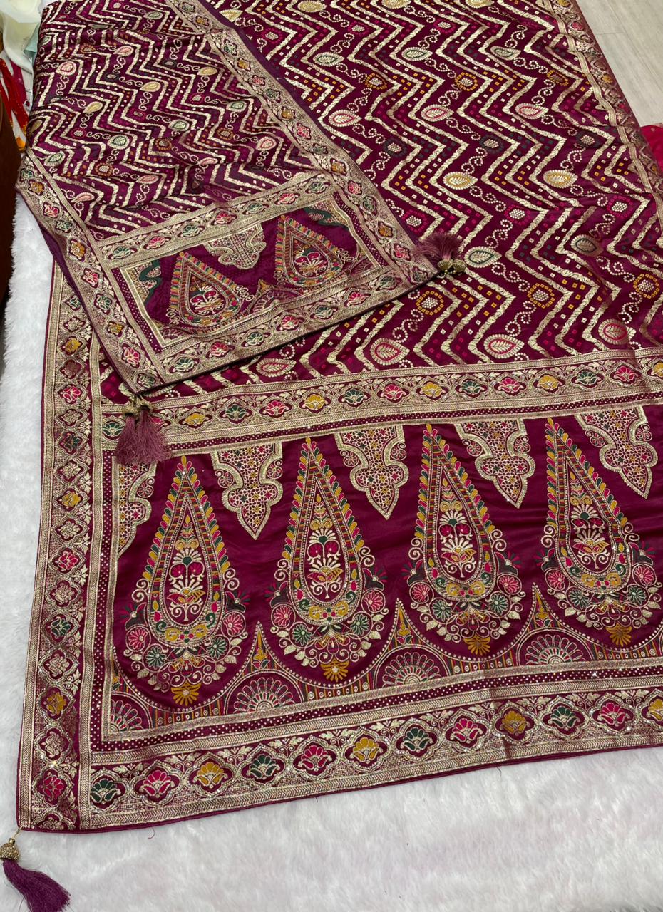 AJ-YUKTI-DUPTTA SATIN SILK SAREE WITH BEAUTIFUL BANDHANI DESIGN WITH FULL HEAVY JARKAN WORK WITH MEENAKARI WORK AND LUXURY TASSELS WITH RICH PALLU WITH DUPTTA WITH HEAVY JARKAN WORK AND MOST TRENDING SAREE