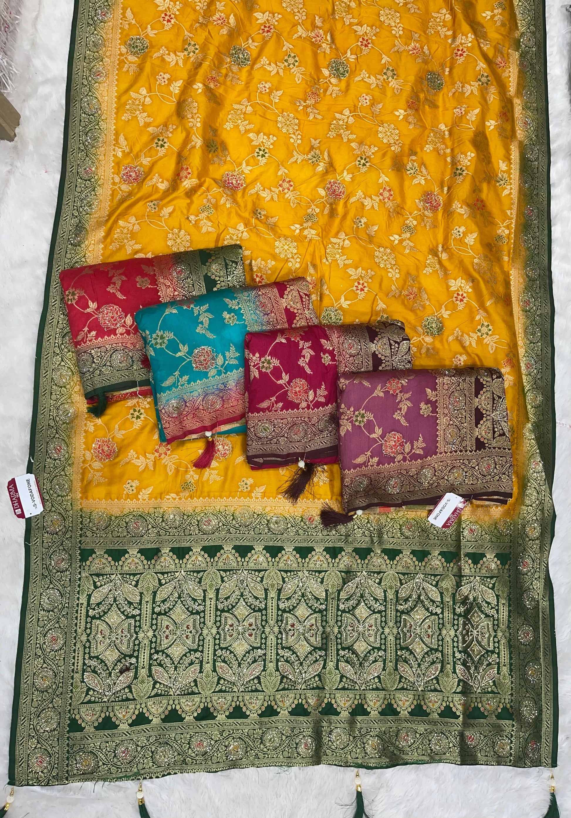 BS-VODAFONE DOLA SILK SAREE MULTI DESIGN RICH PALLU WITH 2D DYING WITH LITTLE JHAL WORK ON BODY WITH TASSELS