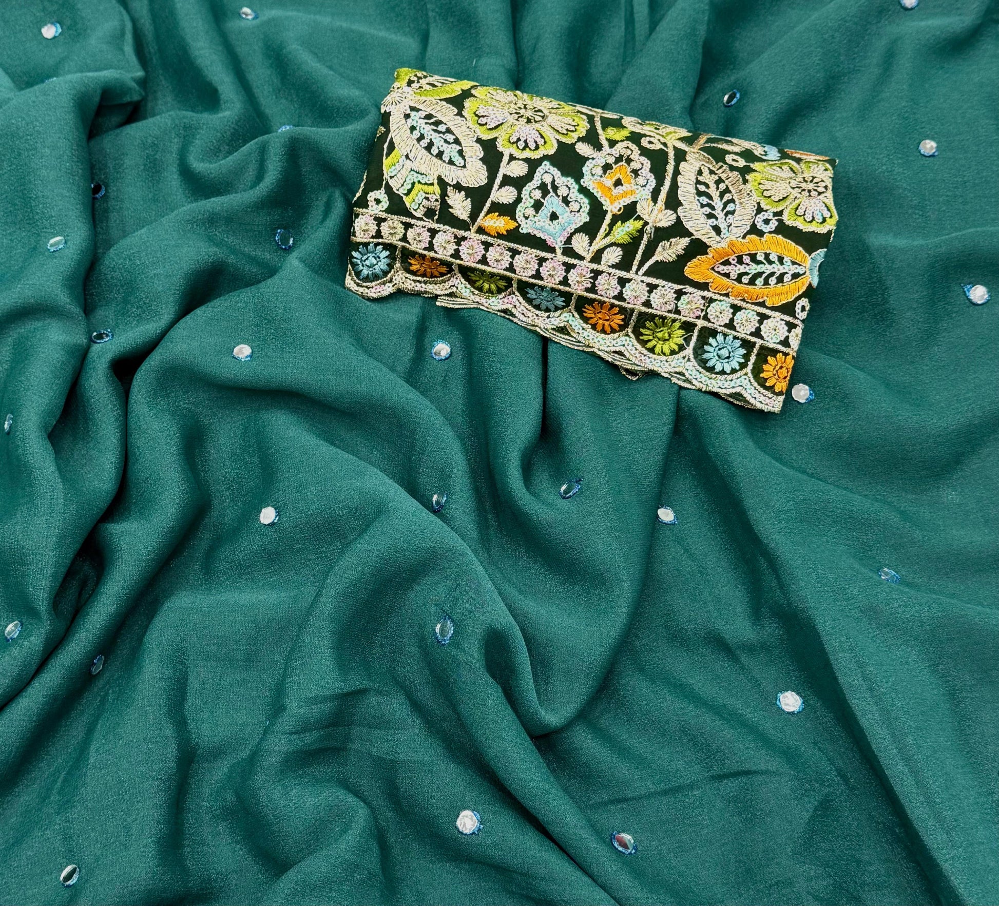 NN-2058 star georgett chiffon fabric with mirror work allover sareewith pipping and tussels with contrast sequence embroidary blouse