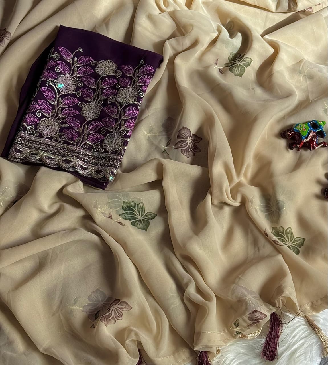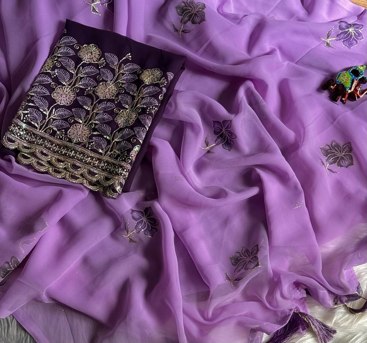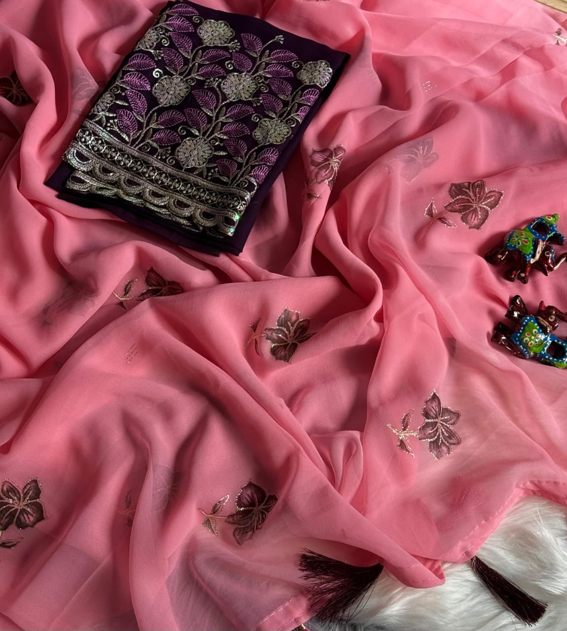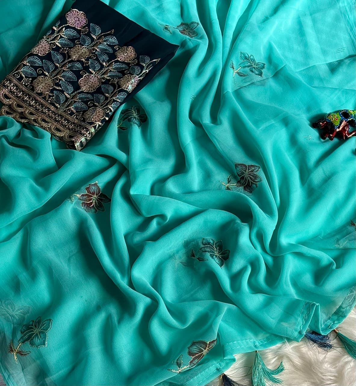 NN-2080 georgette padding fabric with hand brush with gliter border with contrast work heavy sequence embroidary blouse